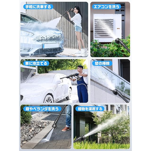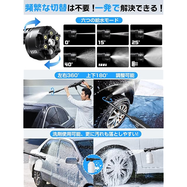 【8MPa喷射压力&洗車や大掃除に便利&3段階調節可能】高圧洗浄機はブラシや雑巾といったほかの掃除道具と異なり、水を当てるだけなのでラクに掃除ができる点が大きな魅力です。高圧洗浄機は強力な8MPa喷射压力によって、3段階水压モードがあり、射程は最大10メートル、長年蓄積したガンコな汚れを落とすことにもできます。オプションパーツは豊富で、自吸機能つきで汎用性が高く、小型のため持ち運びやすく、射を切り替える6in1ノズルや、洗車に便利な左右360°上下180°変換ノズル、フォームノズルが付き、扇型の水流で効率よく洗浄できます。車の下回り・雨どいなどの手の届きにくい場所の洗浄に適しています。一方、高圧ホースは接続しやすく、ノズルの先端を回転させることで6種類の水流を使い分けられる点は様々なシーンで大活躍!洗車や庭、屋外、階段、網戸・窓ガラス、ブロック塀、外壁、駐車場、玄関まわり、自転車・バイク、ベランダ、高い場所、家まわり、浴室、年末大掃除、キャンプ用品の清掃やBBQの片付けにも大活躍。