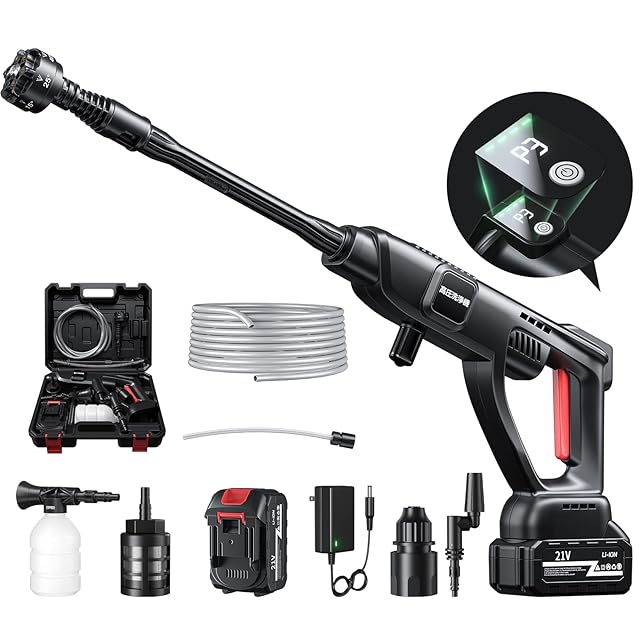 ★【爽快なかけ心地!静かでパワフルなハイエンドモデル】洗車用高圧洗浄機は一目でわかるディスプレイ画面搭載、画面の表示により、モード調整や電池残電確認ができます。850W最上クラスのブラシレスモーターを採用して、ハイパワーが実現され、しかも省エネ!低騒音デザインの高圧洗浄機で、水圧を調節できる家庭用モデルなので洗車だけじゃなくさまざまな汚れをラクに掃除!網戸のほこり・花粉を洗い流したり、外壁の苔を除去したりと、用途はさまざま。 弾力性があるので洗浄作業中も楽々給水ホースに専用フィルターを利用し、ゴミなど不純物の混入を防ぎます。駐車場の泥汚れや玄関のコケなど、屋外のしつこい汚れにもおすすめです。