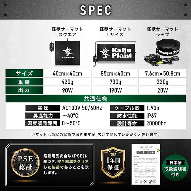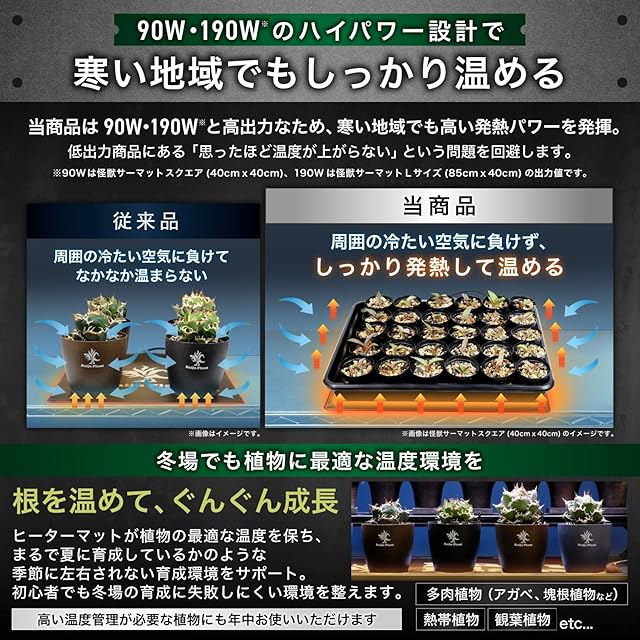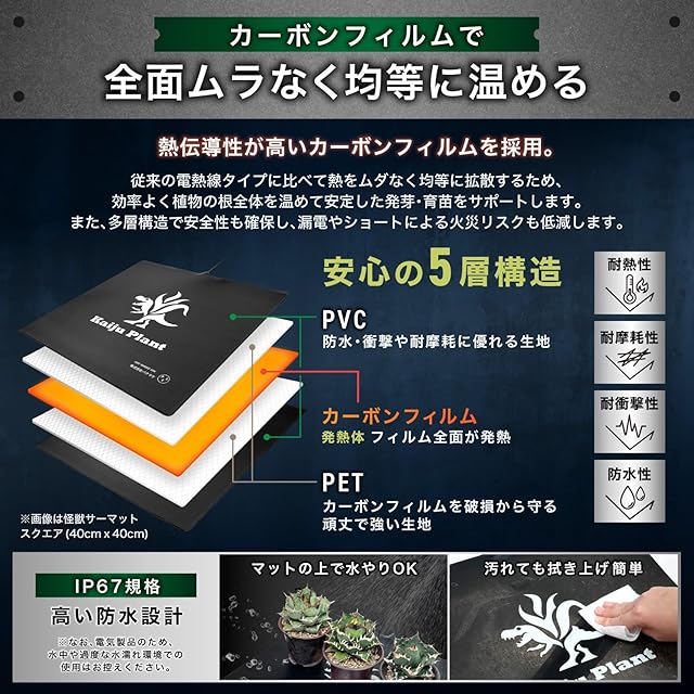 ✅【大切な植物を寒さから守る】Kaiju Plant 育苗用ヒーターマット。冬場の育苗や発根管理に最適です。寒さから植物を守り、冬場の育成をサポートします。ハイパワー仕様で気温に対して約40℃昇温可能。