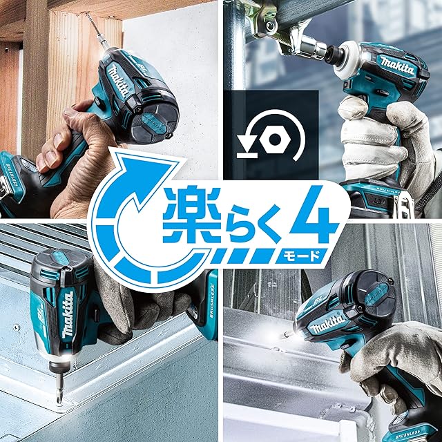 新・ワンタッチビットスリーブ。スリーブを引かず軽く押し込むだけ。より多くの作業をアシスト「楽らく4モード」作業に合わせて、最適なモードを選択可能。①木材モード②ボルトモード③厚板テクスモード④薄板テクスモード +打撃モード4段階切替。「打撃ボタン」で最速/強/中/弱に切替え。パワー、スピード優先の締付けから小ネジ等の繊細な締付けまで対応。