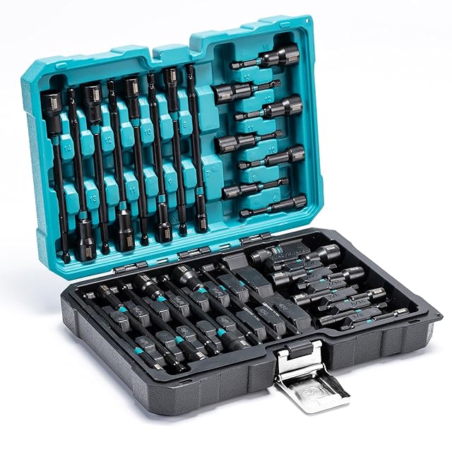 【セット内容】メートルソケット(6mm 8mm 10mm 11mm 12mm 13mm 14mm)7本;インチソケット(3/16" 1/4" 5/16" 3/8" 7/16" 1/2" 9/16")7本;インチロングソケット(1/4" 5/16" 3/8" 7/16" 1/2" 9/16" )6本;メートルロングソケット(7mm 8mm 9mm 10mm 11mm 12mm 13mm 14mm)8本;1/2"四角-1/4"六角軸アダプター1本; 電動ドライバービット(PH1 PH2)2本;収納ケース一個。