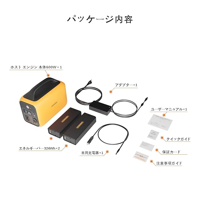 【付属品】1*ホストエンジン600本体、2*エナジーパー電池(各324Wh)、1*180W 車載用充電シガーソケット、1*取扱説明書(日本語)が付属します。何か問題や不具合などがございましたらカスタマーサービスへお問い合わせください。