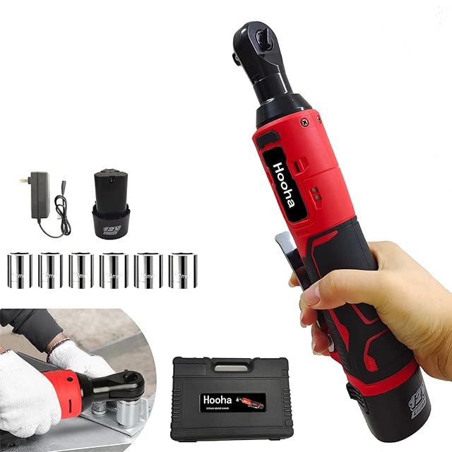 Hooha 充電式ラチェットレンチ 多機能 電動ラチェットレンチ 12V 差込角3/8" 最大トルク 55Nm 2.0Ah バッテリー1本 レンチ コードレス 正逆転両用 無段変速 負荷保護 LEDライト タイヤ取り外し 自動車の修理 ナット締め ボルトが緩む 現場改装 出張修理サービすス 11/12/13/14/15/17mmインパクトソケット6本 日本仕様充電器 収納ケース付き 日本語取扱説明書付き