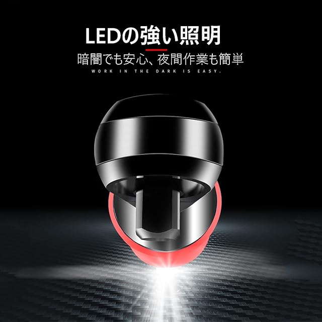 【 バランスの取れた設計*LED照明】ロングな金属構造比率が取れたバランス設計は、強化された頑丈で高い手動トルク力を実現します。また、接合部の応力をも最小限に制御。滑り止めグリップ、ゴムオーバーモールドソフトグリップハンドル、エルゴノミックグリップハンドルは快適さとコントロールを実現します。 LEDライトを搭載、トリガーに連動してドライバーの先端のLEDライトが点灯します、ユニットの前面にあるLEDライトは暗い作業場所を照らします。