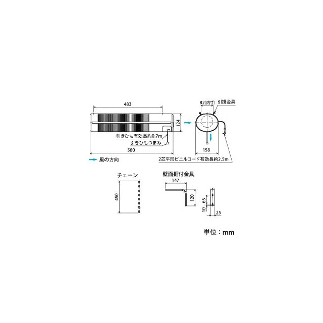 ・一般住宅用(8~12畳)・天井、壁面どちらにも据付可(壁面据付金具付)・引きひもスイッチ式・照明器感覚のチェーン吊り・抗菌仕様(引きひもつまみ部)・低騒音設計