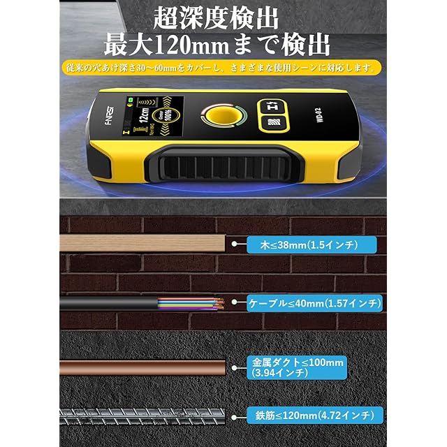 【探知範囲が広い】最大検出深度範囲、鉄を含む金属:120mm。 鉄を含まない金属(銅):100mm。AC:50mm。銅単線導体≥4mm²:40mm。異物(木など):38mm。