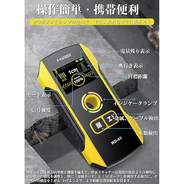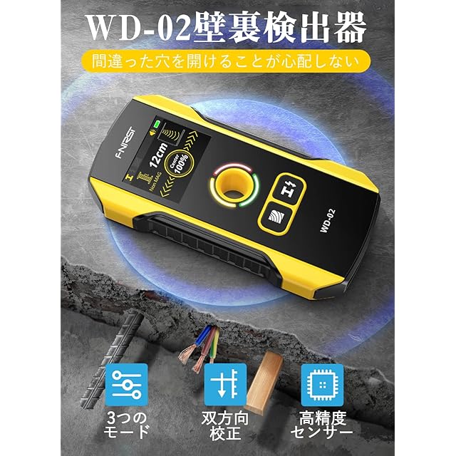【幅広く使える】高精度センサーを持つことで、簡単に壁や天井、床などの後ろに隠された木製または金属製の間柱や金属(鉄筋など)、電線を検出または間接検出することができます(各種類の壁に対し、検出方法は異なる)。スキャン精度を妨害しないため、手や体の一部をスキャンされる表面の上に置かないのがおすすめです。