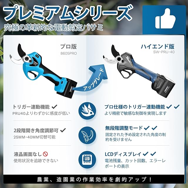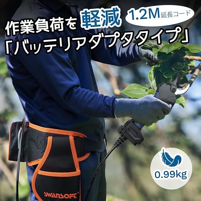[傷防止機能】 Swansoft 電動剪定鋏 40 mm コードレストリガー 21V 4Ah リチウムイオンバッテリー 2個 切断回数と残量表示 日付表示 スプレー 果樹の伐採に最適 PSE認証取得 日本語取扱説明書付属 - 商品コード Pru40. 8605Pro アップグレードされたPru40は、コンパクトで効率的です。