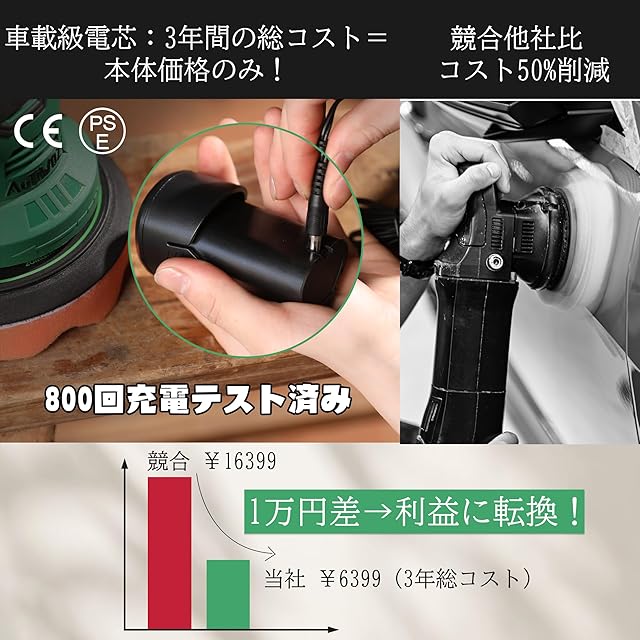 ▲【2.0Ah大容量バッテリー2個★急速充電】業界標準より33%大容量の2.0Ahバッテリーを2個付属。SUV全体のワックスがけを1回の充電で完了可能(最大60分連続稼働)。急速充電対応で40分満充電、350回の充電サイクル(週1回使用で5年以上)。残量不足を防ぐバッテリー交換式設計で、作業中断なし。CE/PSE認証取得で安全性保証。※人為的損傷以外のバッテリー不具合は1年間無料交換