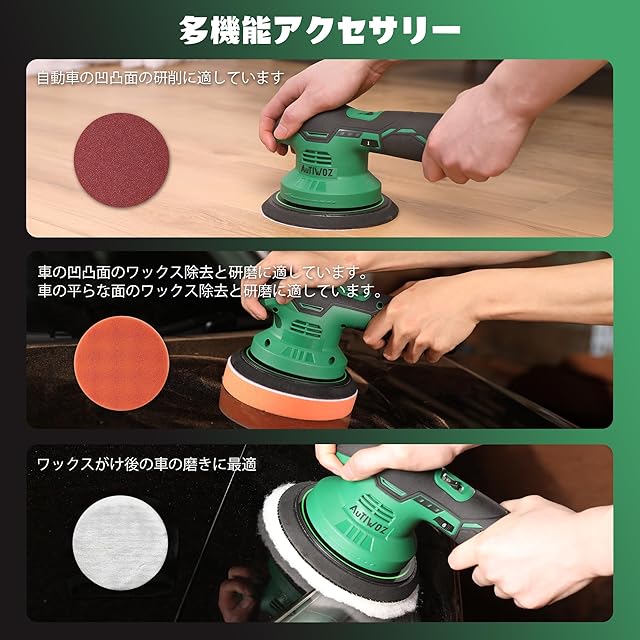 ▲【広域研磨★8mm偏心設計】150mm大型バッキングプレート+8mm偏心軌道が従来比2倍の研磨面積を実現。複雑曲面もムラなくカバーし、作業時間を50%短縮。遠心振動式ダブルアクションが塗装面へのダメージを防止。車・バイク・家具はもちろん、金属サビ落とし・浴室タイル研磨にも対応(付属サンドペーパー/ウールパッド活用可)。