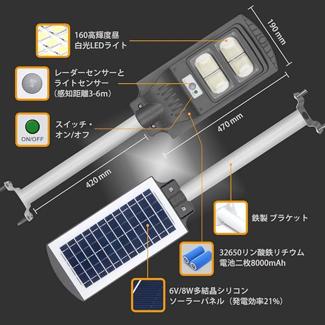 【配線不要・取り付け簡単・0電気代・停電&地震対策】ソーラー街灯は、ネジやガスケットでポールや壁に固定だけで安装完了!配線工事不要ですので、女性でも気軽に安装出来ます。先端技術・優れたデザイン性・高耐用性(5年以上電池寿命可能)などを持ち合わせた屋外照明LEDです。電源配線工事不要で省施工し、複数台設置した場合で公園・商業施設・駐車場・マンション・歩道などで明るさを確保します、完璧な停電対策、地震や台風などの災害で万一電源が停止しても照明機能を保ちます。(ご注意:取り付けの前にスイッチを開けてください)。