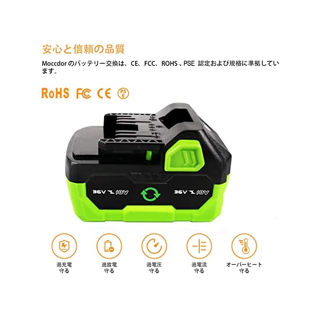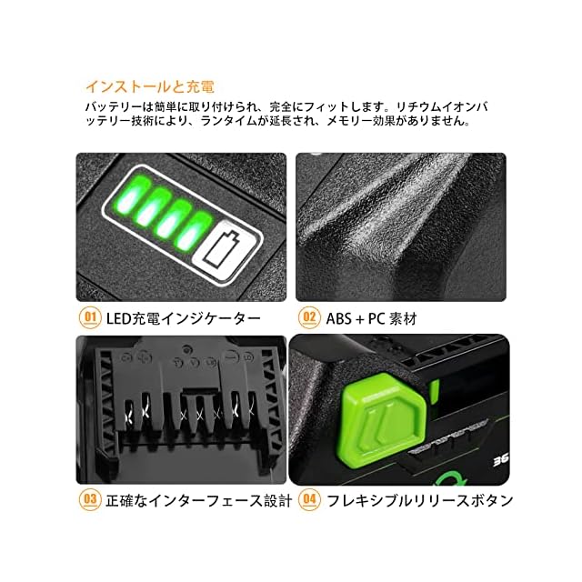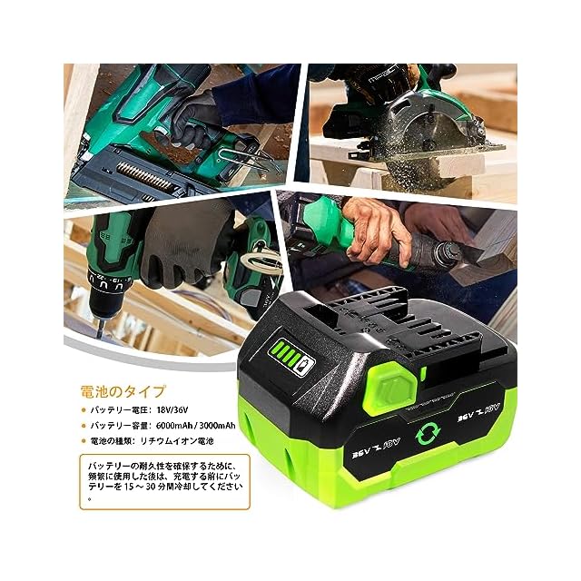 [バッテリータイプ]バッテリー交換容量は 6.0Ah(18V)/3Ah(36V)、バッテリータイプ;リチウムイオン、電圧;18V/36V、バッテリーの耐久性を確保するために、充電する前にバッテリーを15-30分間冷やしてください。