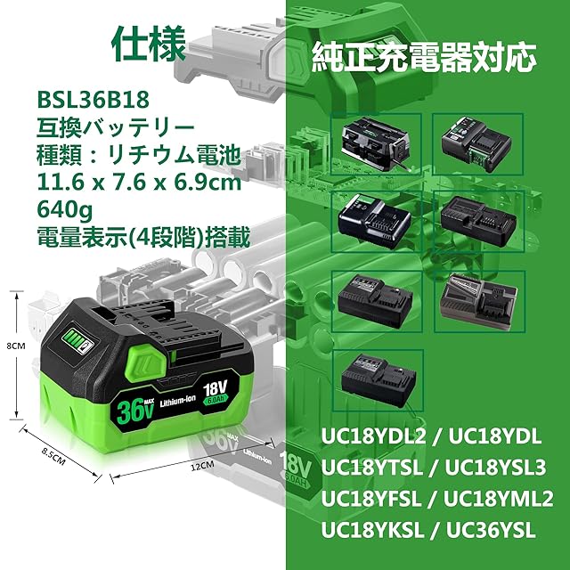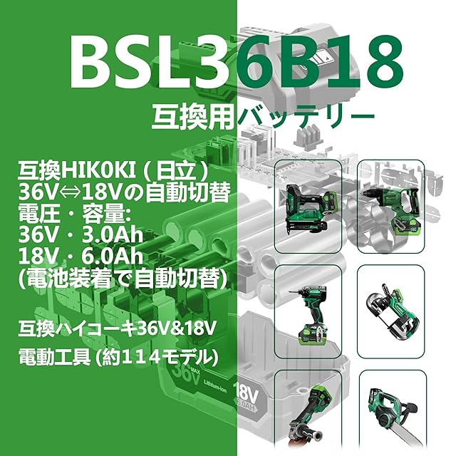 対応機種:互換 ハイコーキ 36V マルチボルトシリーズと互換 ハイーコキ 18V シリーズ 電動工具(*総計114モデル)。対応充電器:UC18YDL2/UC18YDL/UC18YTSL/UC18YSL3/UC18YFSL/UC18YML2/UC18YKSL/UC36YSL.*ご注意:BSL3620、BSL3626、BSL3660対応製品にはご使用になれません。