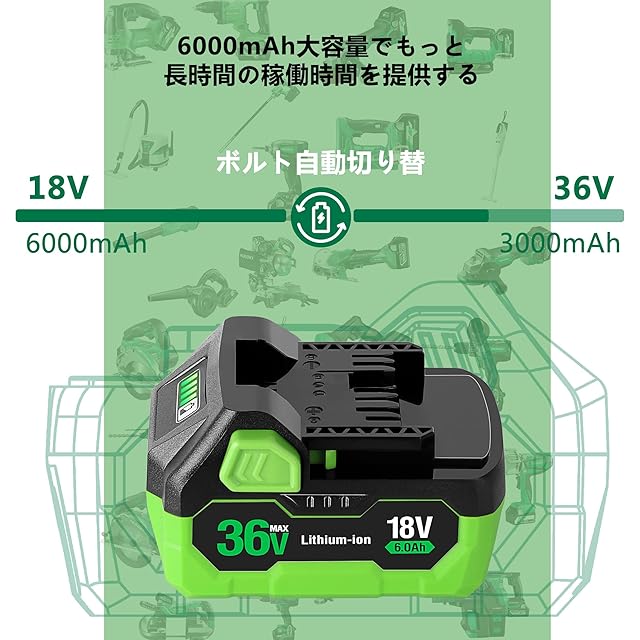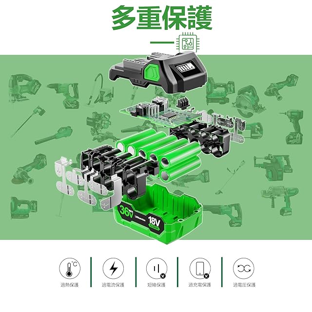 18Vから36まで自動切替(互換ハイコーキのみ)、バッテリーを電動工具に着装すると必要の電圧を判断して36V⇔18Vに自動切替します、電動工具の性能を引き出します。そして、コントロールチップで過充電防止、短絡保護、過熱保護、過電流保護、過電圧保護等機能が搭載しますのでバッテリーの長寿命と安全性を保障します。