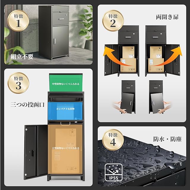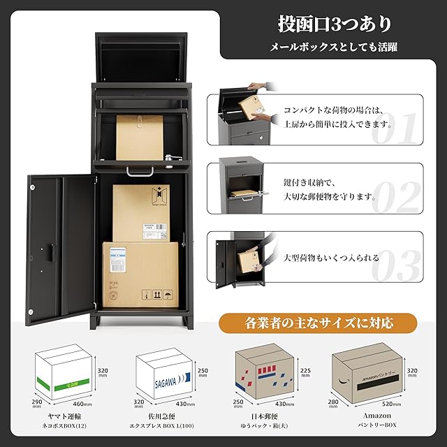 【防水防塵・投函口三つ】Claiksの宅配ボックスであなたの暮らしをもっと便利に!投函口三つであらゆるサイズの荷物もメール類もしっかり収納。両開き構造で設置場所を選ばない。防水・防塵設計で、どんな天候でも安心。盗難防止対策も万全。耐久性抜群で、長く使える宅配ボックスです。