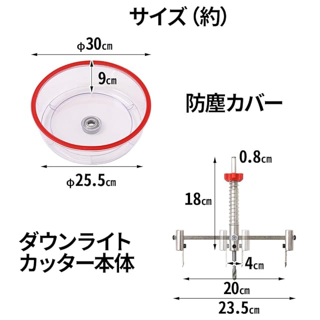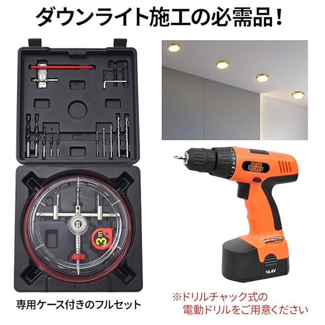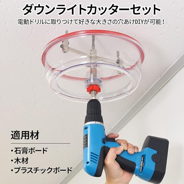 【ダウンライトカッターセット】 ダウンライト施工の必需品! 電動ドリルを用い、40mm~200mmまで任意の大きさに円状の穴を開けれます。 防刃カバーも付いていますので、削りかすが飛び散らず、天井にダウンライトを取りつける際の穴あけ作業に適しています。