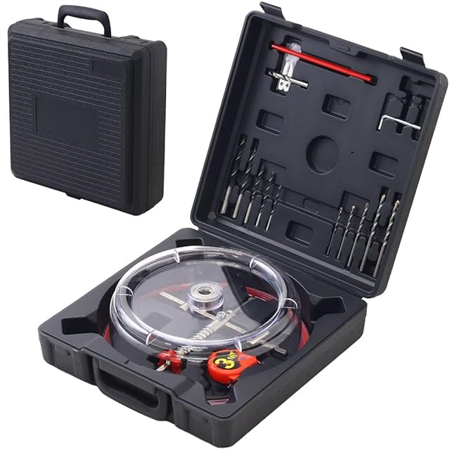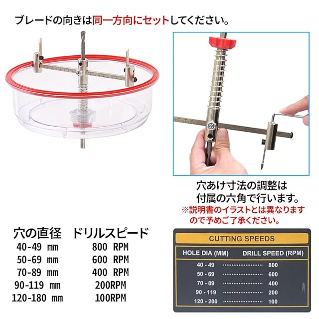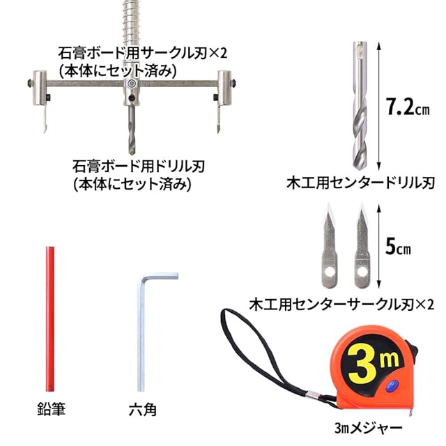 【セット内容】 カッター本体、防塵カバー、石膏ボード用ドリル(φ10mm、φ8mm、φ6mm、5mm、φ4mm)、木工用ドリル刃(φ10mm、φ8mm、φ6mm、5mm、φ4mm)、石膏ボード用センタードリル刃(本体に初期装着)、石膏ボード用サークル刃×2(本体に初期装着)、木工用センタードリル刃、木工用サークル刃×2、六角、鉛筆、3mスケール、説明書(英語表記)、専用収納ケース