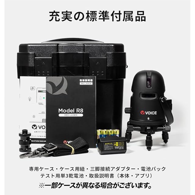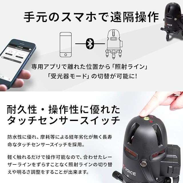 ✅【シリーズ累計 96,000台突破!】VOICE レーザー墨出し器から、デザインと機能をアップグレードしたモデルが登場。マットブラックを基調としたスタイリッシュなデザイン。専用アプリを使うことで、手元のスマートフォンから「照射ライン」や「受光器モードの」の切替が可能に。