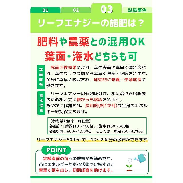 参考希釈倍率:定植前[噴霧]10~100倍・[潅水]100~300倍、定植以降 800~1,500倍 (希釈倍率は任意です)