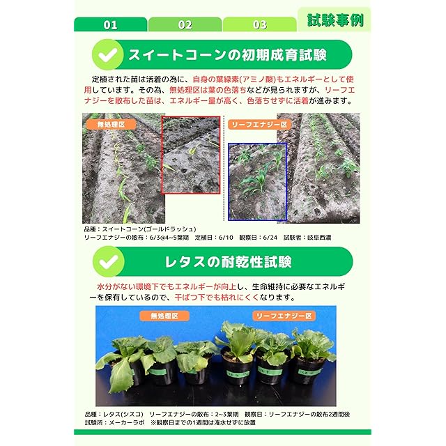 適用植物:果菜類、葉菜類、根菜類、穀物類、花き類、芝生、果樹などさまざまな植物に使用可能