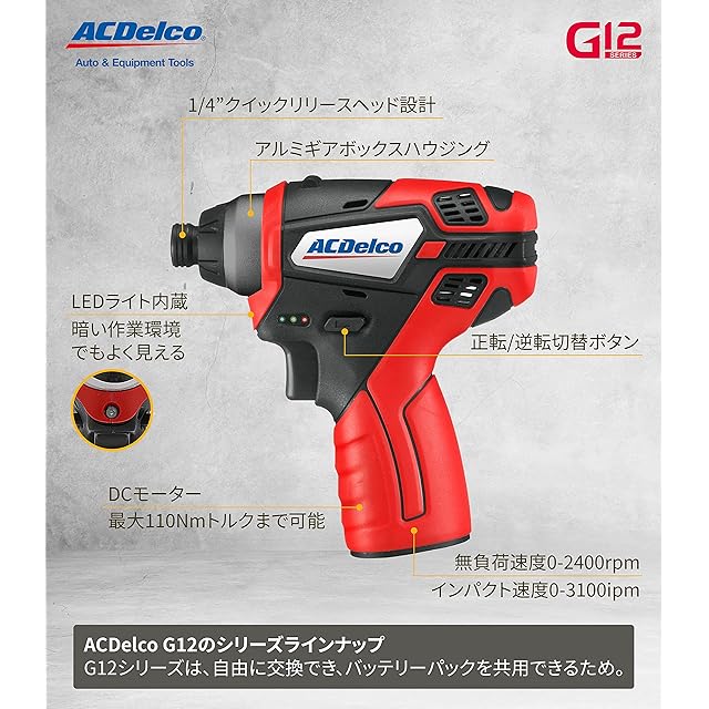 ACDelco G12 10.8V 充電式 インパクトドライバー 1/4” コードレス(六角)最大トルク110Nm 正逆転切替 LEDライト内蔵 DIY家具組み立て 木工作業 家の日常修理 G12共通バッテリーシリーズ (ツール本体のみ) ARI12105T