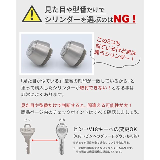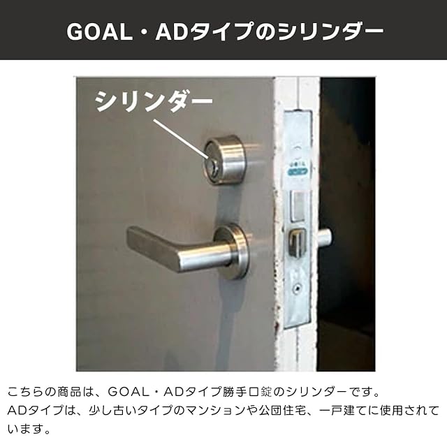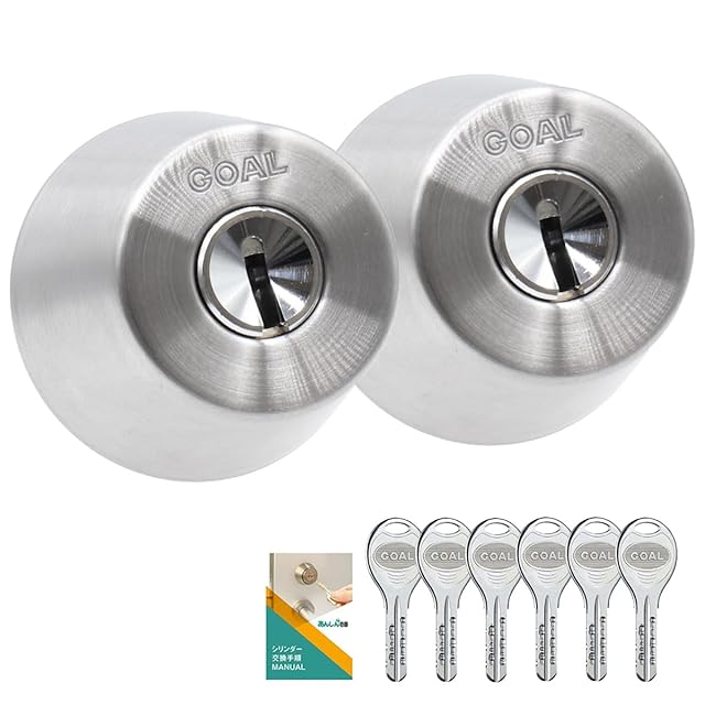 GOAL(ゴール)のADの交換用シリンダーです。2個同一なので、上下を同じ鍵で開け閉めできます。耐ピッキング性能に優れたディンプルシリンダーV18を採用。キーは6本付属しています。必要な工具はプラスドライバーだけ!交換方法を写真付きで解説した交換手順書がセットになっているので簡単に鍵を交換することができます。
