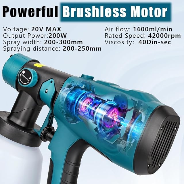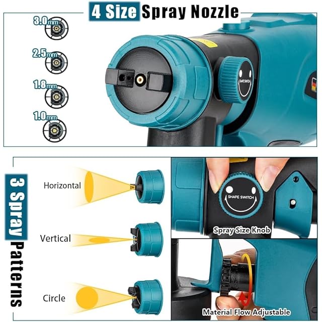 3つのスプレーパターンオプション:水平、垂直、円形の3つの異なるスプレーパターンと1.0mm、1.8mm、2.5mm、3.0mmの4つの銅製ノズルサイズで、さまざまな塗装プロジェクトに対応できます。最大の塗料粘度は40 DIN/secで、最大速度は1600 mL/min、定格速度は42000rpmで、高出力のブラシレスモーターが搭載されており、1000ml大容量スプレー缶を搭載し、スムーズで迅速な塗装作業を可能にし、時間を大幅に節約します。