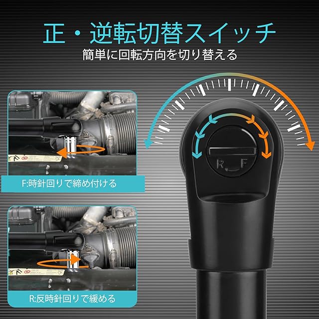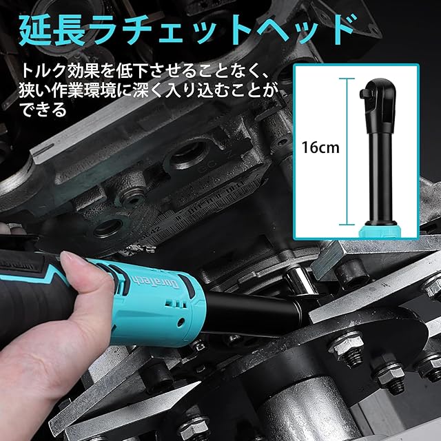 【延長ラチェットヘッド&誤操作防止機能】一般的な電動ラチェットヘッドとは異なり、16cmの延長ラチェットヘッドを提供します。トルク効果を低下させることなく、狭い作業環境に深く入り込むことができます。ロックスイッチでレンチのオン・オフに切り替えています。オフの場合、使っていない時を自動判定して意図しない操作を無効化する「誤操作防止」機能が搭載されて偶発的な状況を防ぎます。