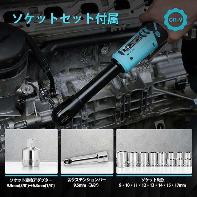 【速く取り付け&豊富な付属品】お客様のニーズに合わせて多様なアクセサリーをご用意しております。バッテリー2個、急速充電器1個、収納バッグ1個、ソケット8点(9・10・11・12・13・14・15・17mm)、ソケット変換アダプター1点(9.5mm(3/8")→6.3mm(1/4") )、エクステンションバー1点、日本語取扱説明書です。ナットのサイズに対応したソケットを差し込むだけで、すぐ応用でき、工具を使わず、自由に交換できる便利さを持ってます。ラチェットヘッドの差し込み角が9.5mmで、ほとんどの市販のソケットを使用でき、使えるに幅広いラチェットレンチです。