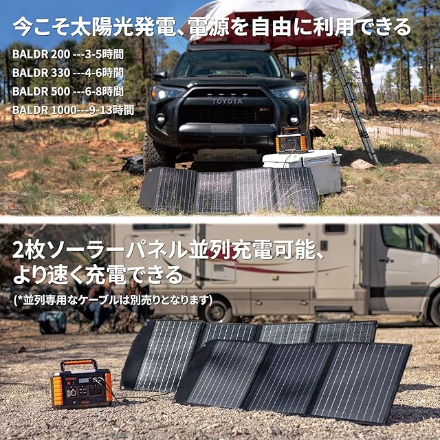 【ご注意】①BALDR ソーラーパネルを使用時の発電電力量は、実際の日射、設置場所の周辺環境などの条件により大きく変化する場合があります。製品に関して何かのご問題があればお気軽くにご連絡ください、3年間保証(登録後)の無料な交換または修理のサービスを提供致します。②大容量なポータブル電源は同型番のBALDR 太陽光パネル二枚で並列接続可能です、並列接続専用なケーブルを別途で購入する必要があります。並列にはDC7909のY字型並列専用なケーブルを別途で購入して、接続すればより効率的な発電は簡単にできます、詳細な並列方法はドキュメント欄のユーザーガイドをダウンロードしてください。