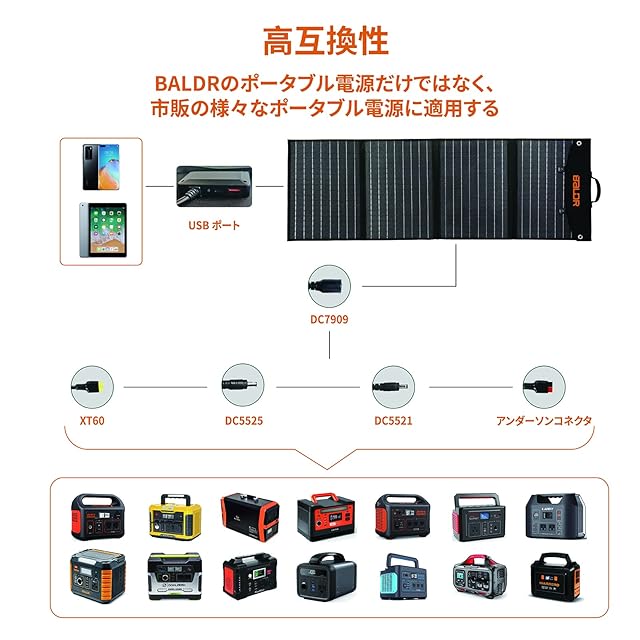 【高い互換性】DC5521、DC5525、DC7909、XT60、Anderson(アンダーソン)など5種類のコネクタを装備。BALDRの携帯電源だけでなく、市販のほとんどのポータブル電源でも充電が可能です。規則正しい配置の単結晶セルは高い出力転換率を持ち、1000Whの大容量携帯電源は約9〜12時間で満充電可能です。さらに、2枚を並列に使用すると約5時間で充電が完了します。地震や台風などの災害時の緊急用品としても活用できます。充電可能かどうか不明な場合は、ポータブル電源販売者にアダプター仕様をご確認ください。(注意:Jackery 1500 PTB152および2000pro携帯電源は互換性がありません。これらにはDC8020プラグが付いているためです。互換性がある場合は別途変換プラグを購入する必要があります。)