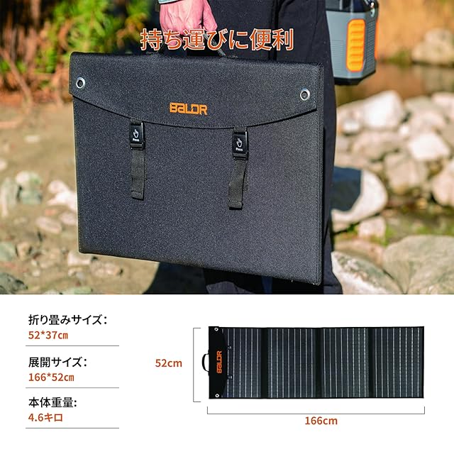 【ETFE素材採用】BALDRのソーラーパネルは、98%の高透過率を持つETFEフイルムを採用しています。他のPETフイルムと比較して、耐熱性と耐久性が優れています。長時間太陽光にさらされても高温に耐え、火災や爆発の危険はありません。防水機能はIP65防水等級であり、通常の小雨や小雪に対するIP65規格(電気機器保護等級)に準拠しています。重量は約4キロであり、折りたたみ可能で片手で持ち運びやすく、収納スペースをあまり取りません。(完全に防水ではなく、大雨や洪水には耐えられません。)