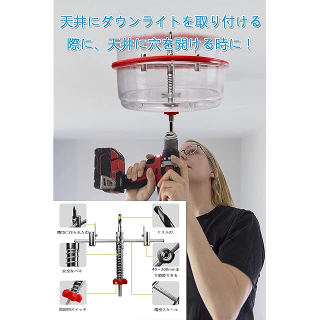 ダウンライトカッターセット Φ40-200mm対応 ドリルドライバー 穴あけ 石膏ボード・ケイカル板・コンパネ対応 ダウンライト取り付け用の穴あけ、天井材の穴あけ作業に最適【40-200mm】