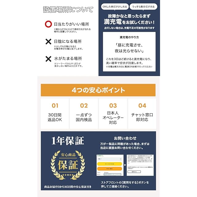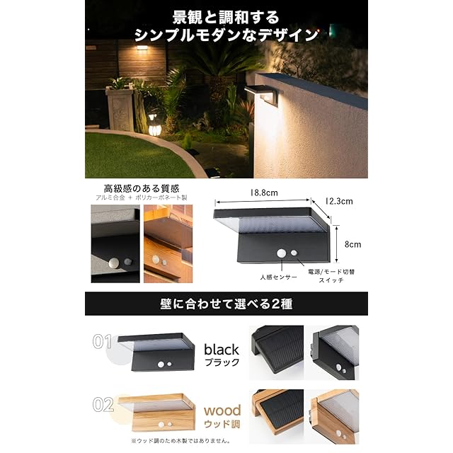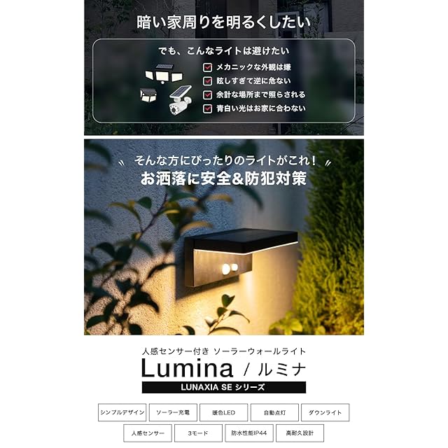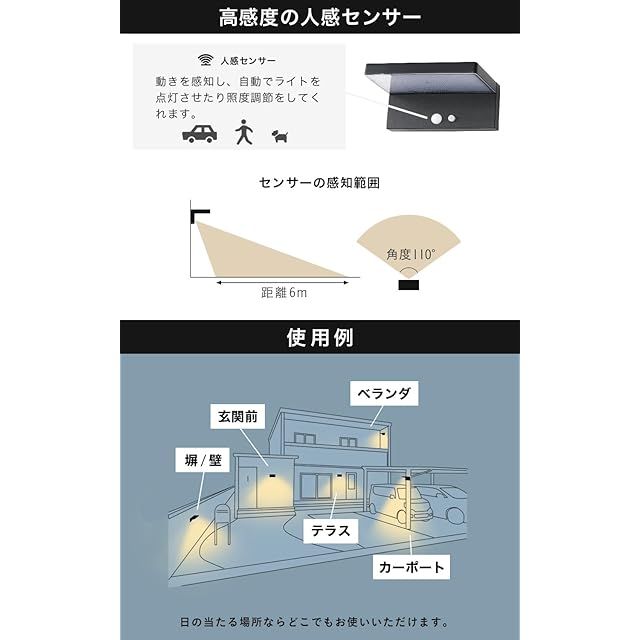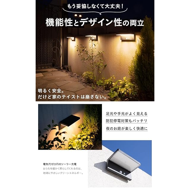✅【暖色系の程よい明るさ】 屋外用の人感センサーライトには珍しい、玄関やお庭を温かな雰囲気にライトアップできる電球色LEDを採用。安全を確保し夜の景観をより良くできる丁度良い明るさにこだわりました。ホテルライクな外構照明としておすすめのソーラーライトです。