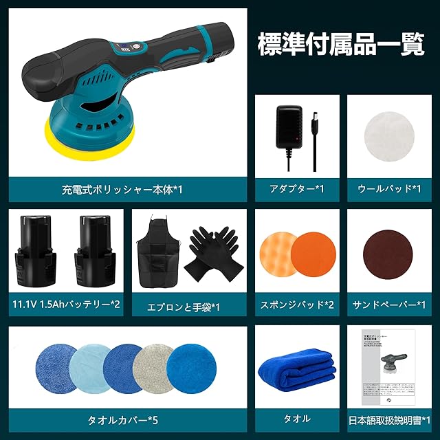 豊富な構成:充電式ポリッシャー本体1台、11.1V 1.5Ahリチウムイオン蓄電池2個、バッテリー充電用アダプター1 個、エプロン1枚、タオル1枚、手袋1組、波型スボンジパッド1枚、平型スポンジパッド1枚、サンドペーパー1枚、ウールパッド1個、タオルカバー5個、日本語取扱説明書1 冊。この充電式ポリッシャーは市販のΦ125 ~ Φ150 mmの研磨パッドを使用することができる。万が一納品された充電式ポリッシャーに欠陥があった場合は、無料で交換します。下記の手順でご連絡ください。【注文履歴>該当する注文を選択>注文内容を表示>商品をクリック>店舗名をクリック>質問する】