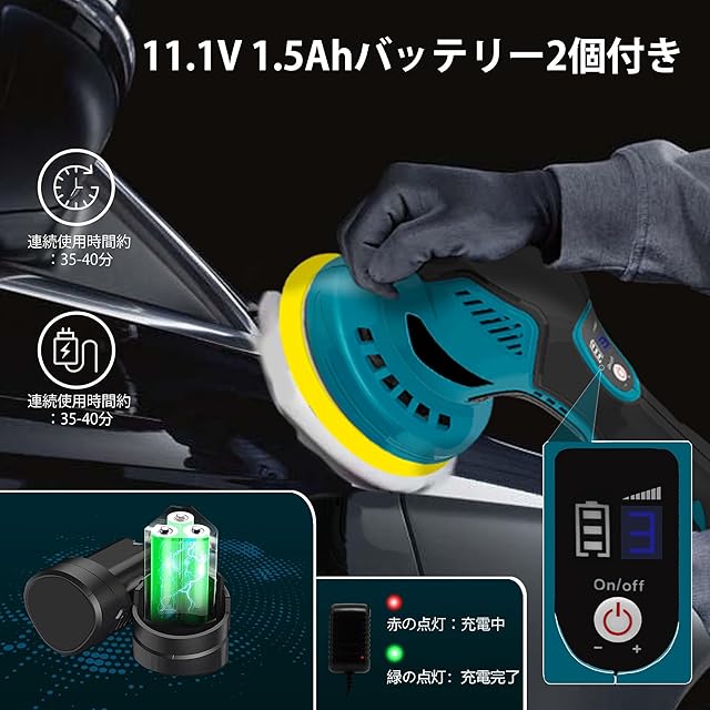 11.1V 1500mAhバッテリー2個搭載:ポリッシャー電動にはバッテリーは2個付属しているので交互に使用でき、作業途中でバッテリー切れで作業が中断することもなく便利です。ポリッシャー電動のバッテリーは通常2~3時間で充電でき、フル充電すれば40分以上普通に使用できる。