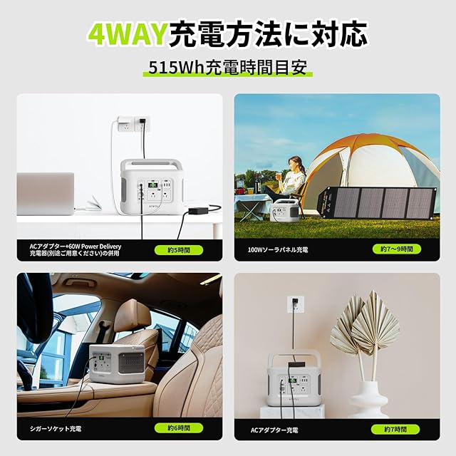 【大容量 515Wh/160938mAh】515Whの電力容量を持ち、他の用バッテリーよりも同じ電子機器を効果的に長く使用することができます。フル充電後、携帯電話、ノートPC、電気炊飯器、車載用冷蔵庫、ジューサー、ドローンなどを充電し、自宅/旅行/キャンプ/RVに使用することができます。多数の家電やデジタル製品が利用可能です。ご家庭の防災備品にも最適です。