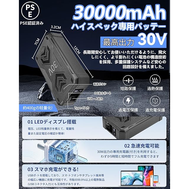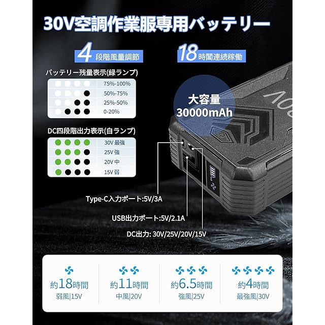 空調作業服 30V モバイルバッテリー 超高出力 超大風量 暴風 長時間 30000mAh コンパクト 大容量 4段階風力調節 Type-C急速充電 DC/USB出力ポート付き 日本語取り扱い