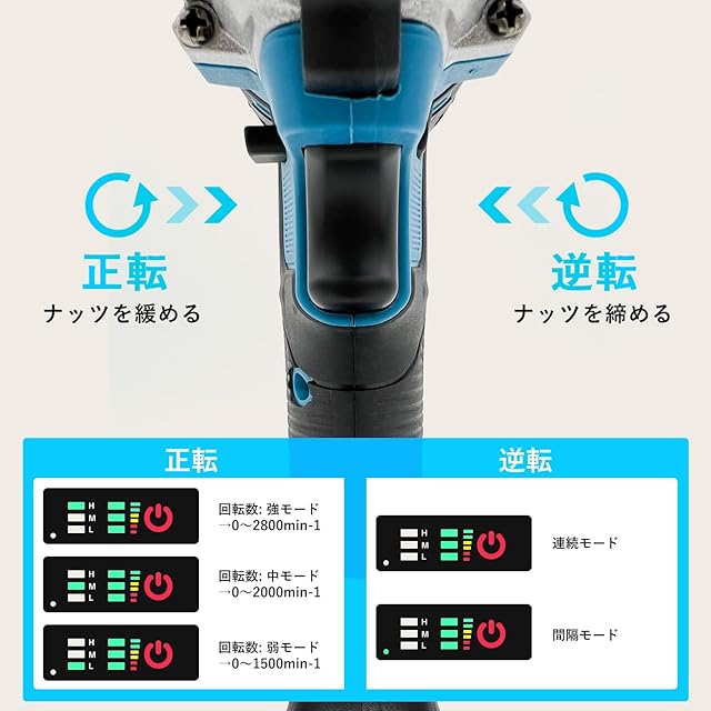 【無段変速・正逆転両用・安全ロック】:「回転+打撃」でパワフルインパクト機構、LEDライト付無段変速インパクトレンチです。正逆転レバーの位置を調整することで、ビットの回転方向を切り替えでき、ネジを締め付けるだけでなく、ネジを緩めることも可能です。(ご注意:使用しない時、正逆転切り替えレバーを中間の位置にしておいて、不意な始動で、ケガの恐れがあります。)
