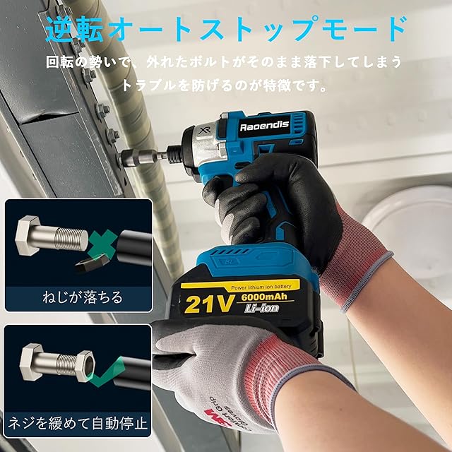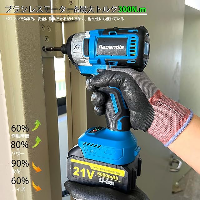 【21V超強力】最大トルク:300N・m。回転数:弱モード→0~1,500min-1、中モード→0~2,000min-1、强モード→0~2,800min-1。打撃数: 弱モード0~1,350min-1、中モード0~2,900min-1、强モード0~3,800min-1。型番:QJZ-B。当商品はRAOENDIS 21Vバッテリーに対応して、RAOENDIS 21V/18V 工具とのバッテリーは交換性を持ちます。
