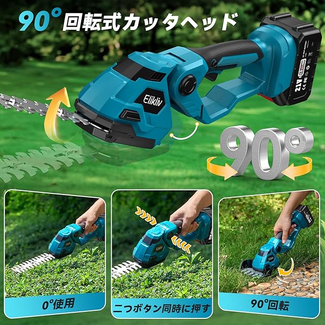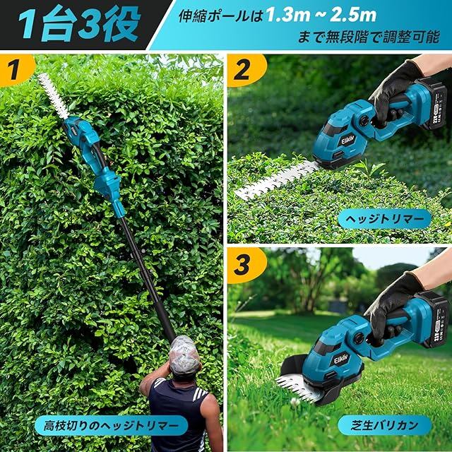 【2025新型】Elikliv ポールヘッジトリマー 電動芝生バリカン 充電式 剪定トリマー 1台3役 着脱伸縮式 190-310cm長さ無段階調節と0°~180°ヘッジ角度が調節可能 両刃駆動 強力 4000mAh大容量バッテリー付き 芝刈り 生垣 剪定 枝切り 植木 庭木 植木手入れ ガーデン 園芸