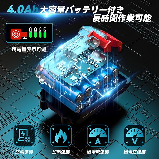 【コードレス充電式& 4000mAh大容量バッテリー付き & バッテリー残量表示】この製品は便利なコードレス充電式設計で、コードが絡まったりひっかかる心配がありません。様々な場所で使用できます。また、 4000mAh大容量バッテリーが付属しており、十分な作業時間が保証されます。このバッテリーは自然放電しにくく、継ぎ足し充電も可能です。いつでもどこでも必要な時に使えます。バッテリーの確認ボタンを押すと、残量が色別 LED で 4 段階に表示され、電力状況が分かりやすいです。