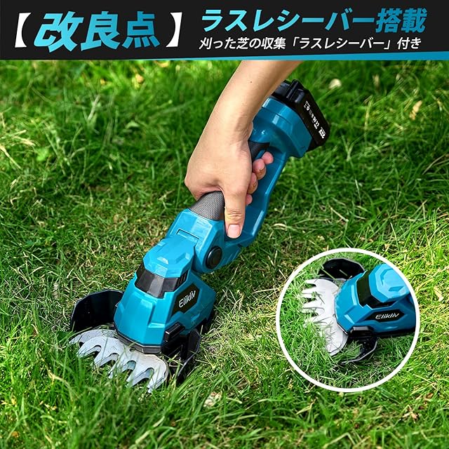 【ハイパワー & 高硬度両刃駆動でグラスレシーバー搭載した剪定トリマー】強力なモーターと切れ味良いダブルブレードが搭載されており、回転数が約 2000 回 / 分で強い力を発揮します。最大切断径は 6mm で、直径 6mm 以内の枝を切ることができます。SK5 高炭素鋼から鍛造された刃は硬くて錆びにくいです。両刃駆動の設計により、作業効率を大幅に向上させることができます。しかも、刈り取った芝を受け止め、芝刈後の掃除が楽なグラスレシーバーが付いており、壁や刃を傷つけずにキワメ刈りもできます。さらに、最大切断長 200mm の生け垣剪定ブレードと最大トリミング幅 120mmの芝生剪定ブレードが装備されています。芝生バリカンとヘッジトリマーを自由に切り替えることができます。交換するときはツールが必要ありません。上に向けて安全ロックを外し、両側のブレード解除ボタンを押すと、ブレードを簡単に解放できます。