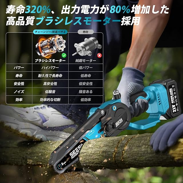 【ブラシレスモーター・高効率切断電動チェーンソー】SEESII 充電式 8 インチチェーンソー M8G は、ブラシレスモーター搭載で、ブラシ式モーター比べ、寿命は 320%延長、出力電力は 80%向上、エネルギー消費量は 50%削減します。作動時に火花発生なくモーター摩耗を抑制し、長寿命と高効率を実現します。補助ハンドルにより、直径 200mm の丸太を 10 秒で切断可能で、作業の時間と労力を大幅に軽減します。さらにオイル注入口搭載によるスムーズな給油機能で、木材・竹の切断、薪作り、庭木の剪定など多様なシーンで活躍します。