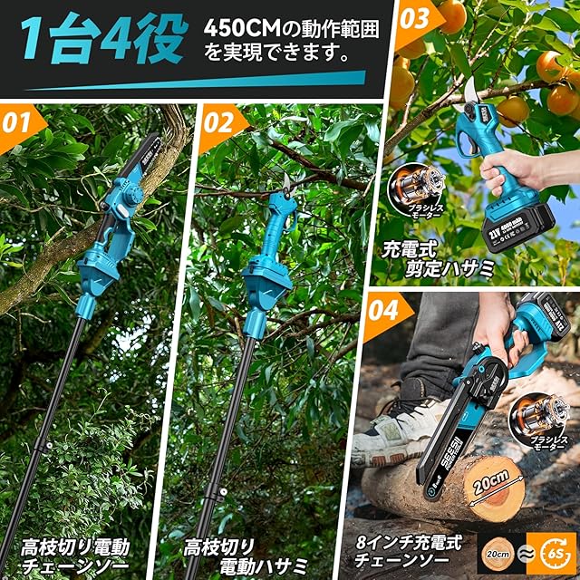 【1 台 4 役・最新 8 インチ高枝チェーンソー/剪定ハサミ】この手持ち 8 インチ高枝チェーンソー/剪定ハサミは、ポール着脱式設計で、手持ちモードと高枝モードを自在に切り替えられます。伸縮ポールは 125cm~250cm まで無段階調整可能で、最大伸長時に約 450cm の高さまで対応し、安全かつ効率的な作業を実現します。ヘッド部分は 0~180° の角度調整が可能で、果樹・木材・竹・庭木の切断など、多様なシーンで活躍します。