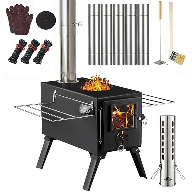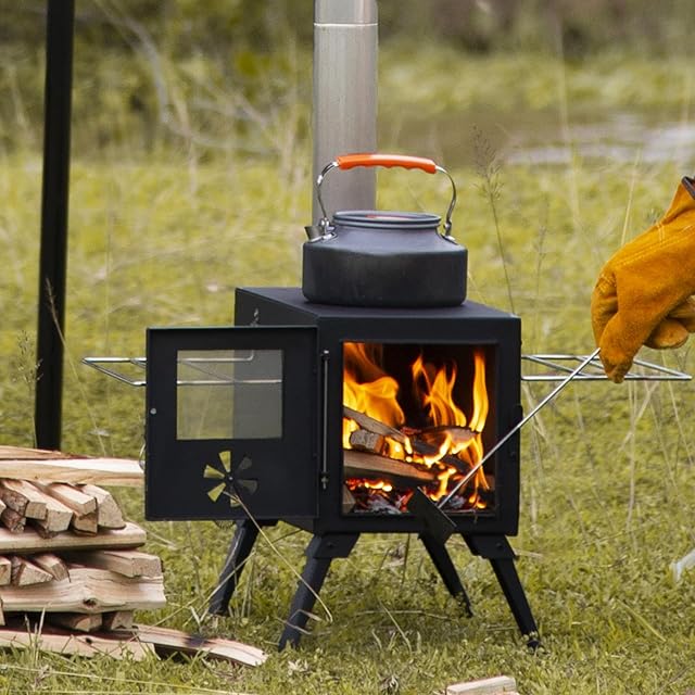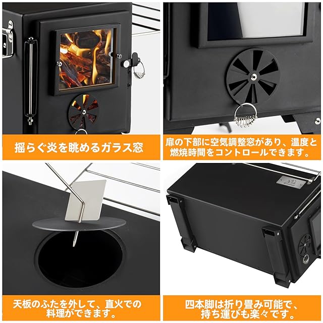 ✅【温度調整しやすい】:テントストーブ本体窓側に空気調節口は開けたり閉めたりできる簡単ダイヤル式。空気の量を調整でき、温度と燃焼時間もコントロールできます。細かい炎の調節ができます。煙突の内部にもダンパーが搭載。少ない薪でも温度を上げやすく、長時間の焚き付けも可能。✅【熱伝導率が高い素材】:アイアン素材で熱伝導が高い素材ので料理に最適!天板の上に鍋ややかんを乗せても調理できます。暖房だけでなく、その熱を利用して料理を作ったり、お湯とコーヒーを沸かすことができます。天板の丸フタを取り外せば焚き火で料理ができ、煮炊きも楽しめます。
