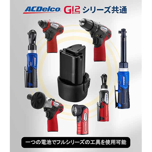 【G12シリーズ共通】このリチウム電池は、ACDelco G12全シリーズ工具のラチェットレンチ、ポリシャ、インパクトレンチ、インパクトドライバー、電動ドリルに共通でご使用頂けます。電池互換性を心配する必要がなく、一つの電池でフルシリーズの工具を使用可能(その他の適用可能なツールについては、ストアをご参照ください)。