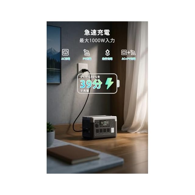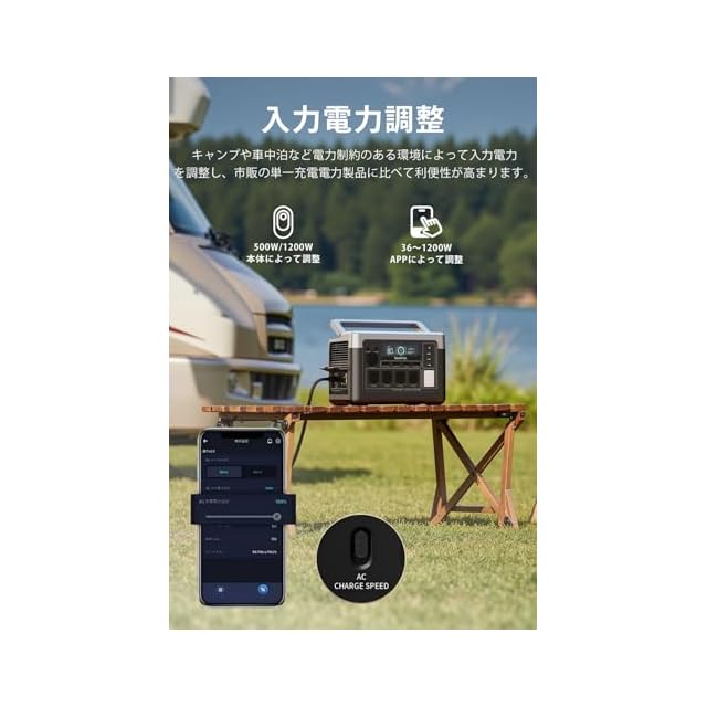 ⚡【AC充電力調整】 本体の入力調整用のスイッチを使うと、AC入力電力が500Wと1200Wとの2段階が選べます。アプリを使うと、1200Wの3%~100%(36W~1200W)を任意で調整できます。ご利用状況に応じて充電入力を調整いただくことで、バッテリー寿命をより長く保つことが可能です。※テスト結果により、低速充電モードではバッテリー寿命が2~3倍以上向上することが実証されています。