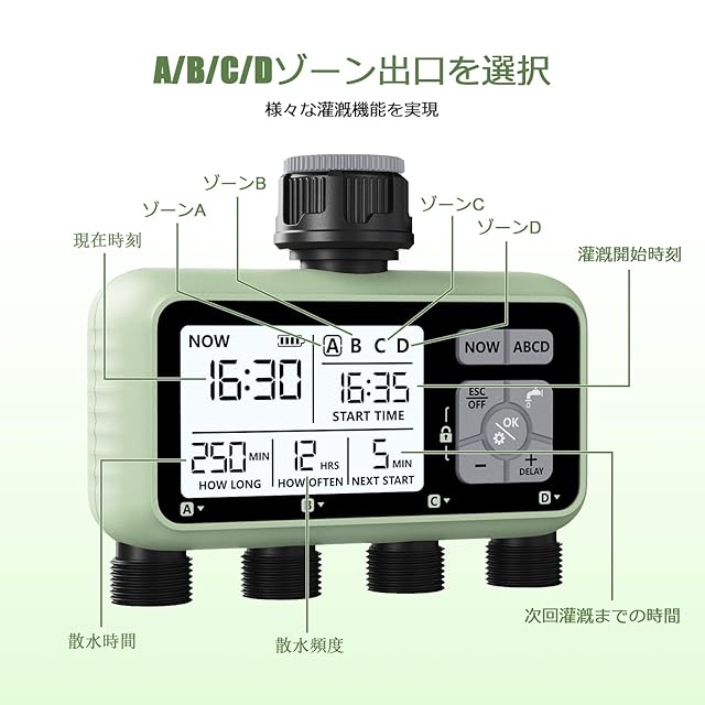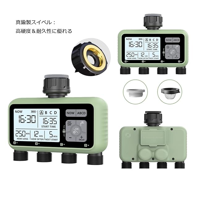 「4つの独立した散水エリア&真鍮材料インターフェイス」:この新しくアップグレードされた灌漑システムは、4つの独立したバルブが装備されている、あなたはより柔軟にあなたの散水計画を設定し、完全に1台のマシンのデュアル-目的機能を実現することができます。新しくアップグレードされた黄色い銅の材料インタフェース、より強い、より強い耐腐食性。