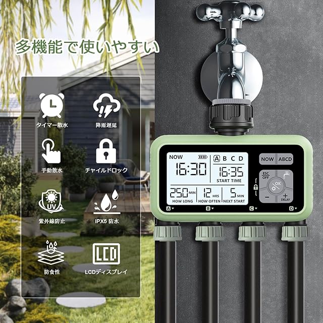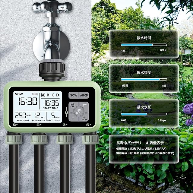 2025年新型 自動散水タイマー 散水ホース 4アウトレット 適格請求書ok 植物灌水 散水システム 散水用具 灌漑システム 給水 観葉植物 室内 鉢植え給水 鉢植え 自動灌漑/子供ロック/大雨遅延/手動灌漑 (グリーン)
